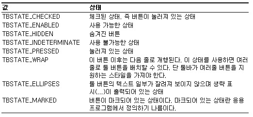 - 툴 버튼 하나의 정보는 다음과 같은 TBBUTTON 구조체로 지정하며 이 구조체가 배열을 이루어 툴 바 전체의 버튼들을 정의해준다.