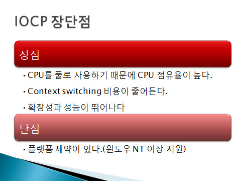IOCP의 가장 큰 장점은 쓰레드 풀을 통한 context switching 비용이 줄어듭니다. 단점은 윈도우 NT 이상 즉 윈도우 2000 이상에서만 지원한다는 점이 있습니다.