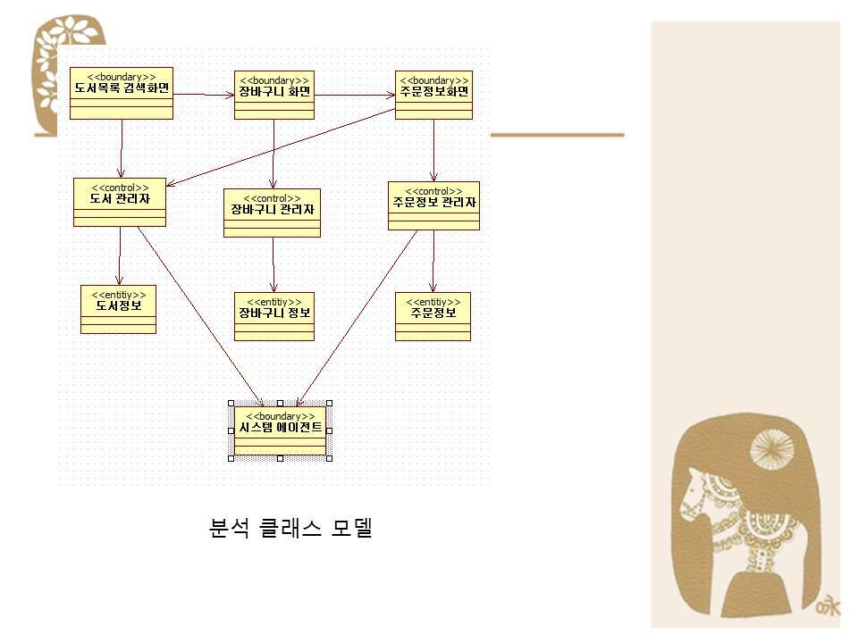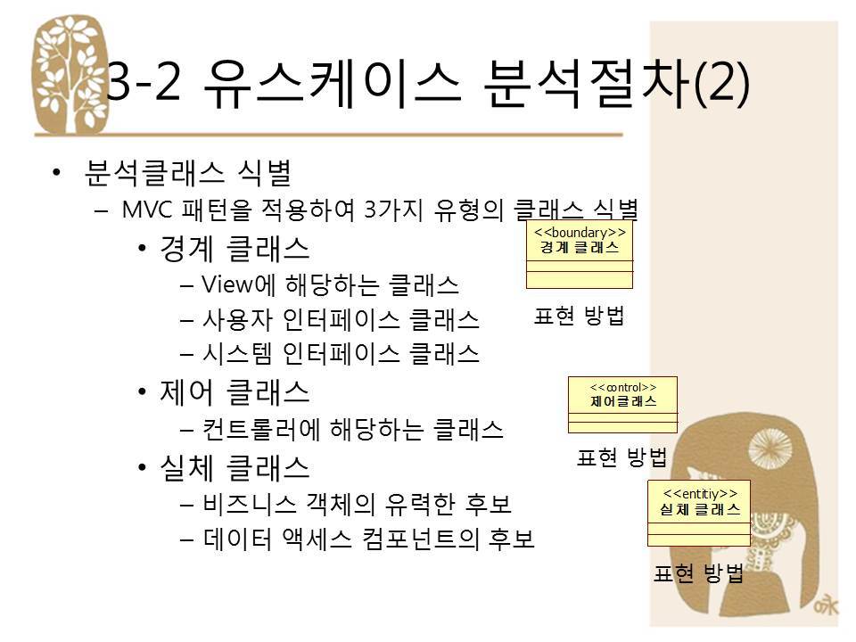 사용자 인터페이스 클래스(사용자가 시스템에서 사용하게 될 화면 사용자 화면에 대한 자세한 모델링은 사용자 인터페이스 모델 생성작업에서 수행하므로 여기서는 단지 경계 클래스만 찾는다.)