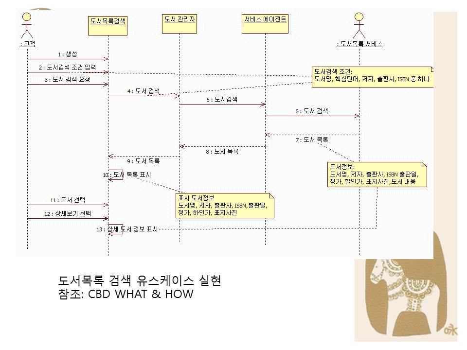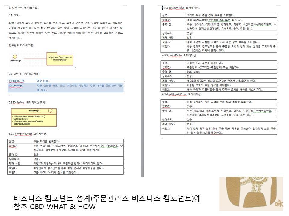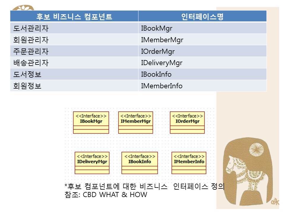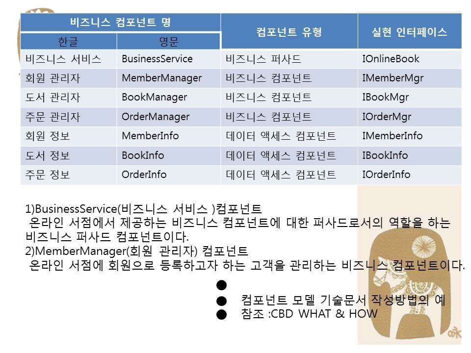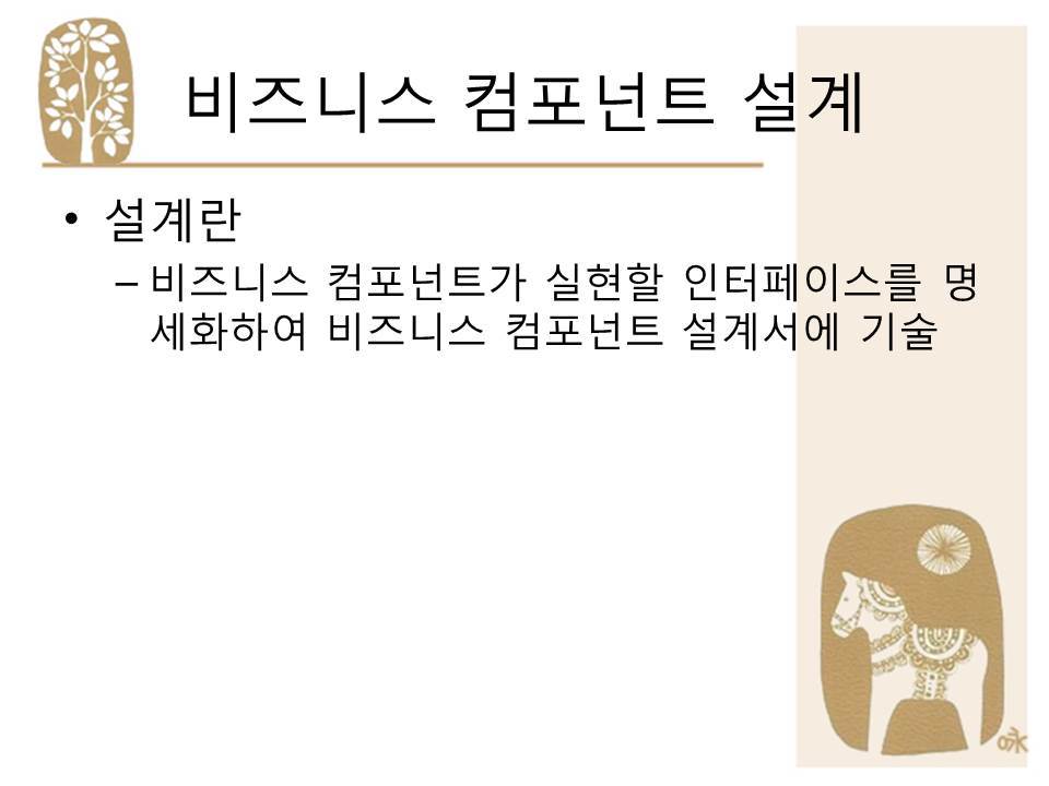 비즈니스 컴포넌트가 실현할 인터페이스를 명세화하여 비즈니스 컴포넌트 설계서에 기술한다. 여기에서 비즈니스 컴포넌트 설계서를 생성하고 유스케이스 실현을 참고하여 인터페이스에 포함된 각 행위 기능을 비즈니스 컴포넌트 설계서에 상세히 기술한다. 입출력매개변수 컴포넌트가 상태를 유지해야할 항목 및 컴포넌트 제약사항등이 기술된다. 비즈니서 컴포넌트 설계서에서는 논리적인 관저점에서 비즈니스 컴포넌트 설계 내용을 기술하면된다. 특정한 기술이 적용된 비즈니스 컴포넌트는 설계는 설계 단계에서 구현 컴포넌트 설계서에 작성될 것이다.