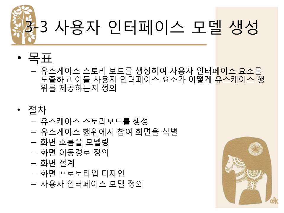 유스케이스 스토리보드를 생성하여 사용자 인터페이스 요소를 도출하고 사용자 인터페이스 요소가 어떻게 유스케이스 행위를 제공하는지를 정의하는 것 , 생성결과물은 UI설계자가 사용자 화면을 디자인하는데 입력자료로서 활용된다.