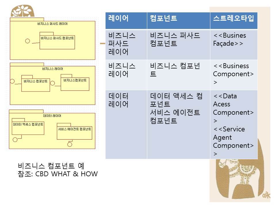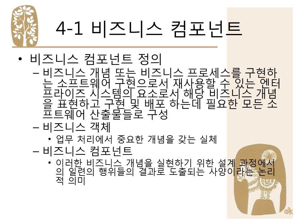 이와 같은 비즈니스 컴포넌트에 대한 정의는 비즈니스 컴포넌트가 물리적인 개념 뿐만 아니라 논리적인 개념도 함께 포함되고 있다는 것을 말해준다.