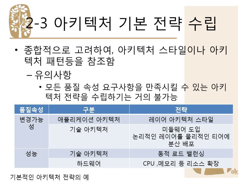 각 품질 속성에 대한 기본적인 아키텍처 전략을 세울때는 애플리케이션 아키텍처 뿐만 아니라, 기술 아키텍처와 하드웨어 구성, 구현 등을 종합적으로 고려하며, 아키텍처 스타일이나 아키텍처 패턴등을 참조해야 합니다.