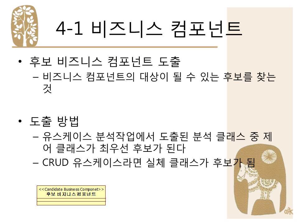 서로 관련된 유스케이스들의 유스케이스 실현에서 유사한 메시지 흐름을 갖는 제어 클래스를 그룹화하여 하나의 후보 비즈니스 컴포넌트로 정의한다. 유사한 책임은 같은 비즈니스 컴포넌트에 속해야 하기 떄문이다.