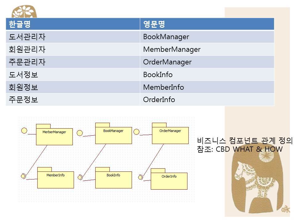 앞의 비즈니스 객체 모델으로 비즈니스 컴포넌트를 도출한 예 입니다.