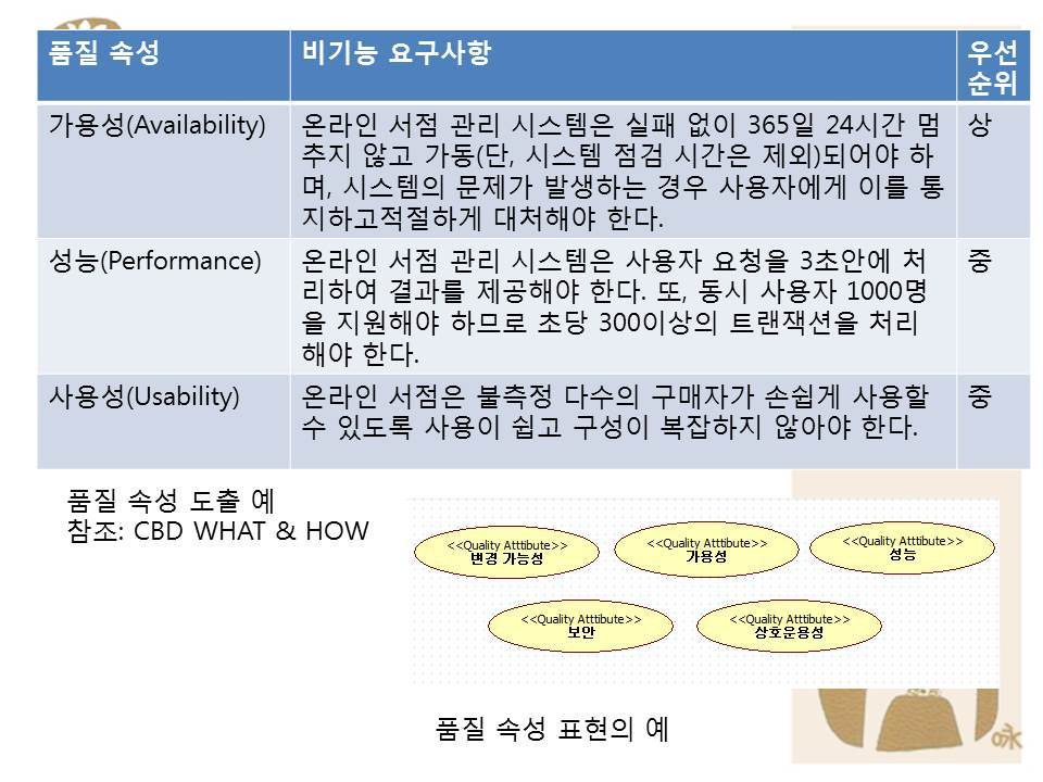 초기 아키텍처 정의를 위해 가장 처음 할 일은 사용자의 비기능적인 요구사항으로부터 품질 속성을 도출하고, 품질 속성에 대하여 수선 순위를 부여하는 것입니다. 0~10 점까지 점수를 매기거나, 상 중 하와 같은 상대적 순위로 걸정할 수 있습니다.