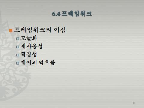 프레임워크 컴포넌트를 재사용하는 것은 소프트웨어 품질, 성능, 신뢰성, 상호 운용성을 향상시킬 뿐만 아니라 프로그래머의 생산성을 상당히 높여준다.