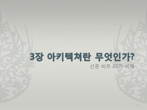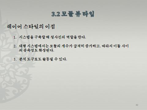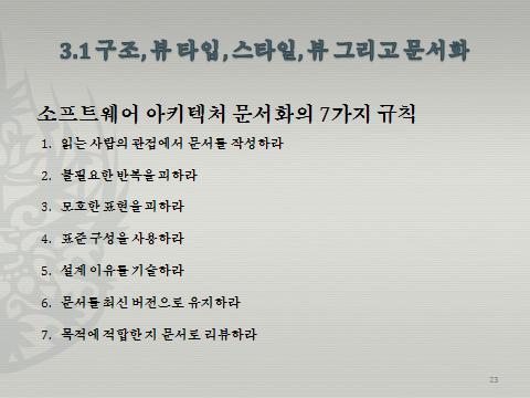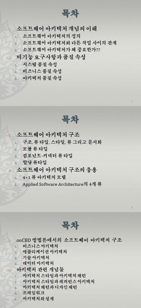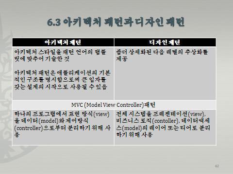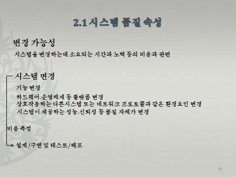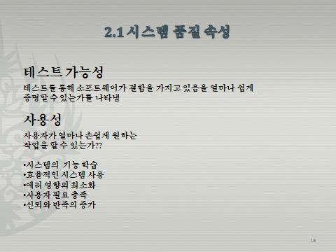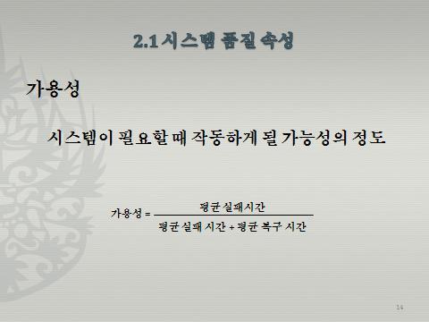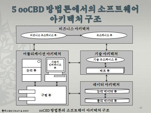 시스템의 실패는 일괄적인 서비스를 제공하지 못할 때 발생 한다. 사용자는 시스템의 실패를 알 수 있게 될 때부터 실패의 원인을 제거함으로써 시스템을 복구해야만 재 가동할 수 있게 된다. User가 system에 작업을 요청할때 시스템은 반응하고 그 결과를 user에게 제공한다 이때 대기시간을 알 수 있다. 분당 또는 초당 처리할 수 있는 트랜잭션의 수로도 표현된다. 인증 : 사용자가 자신임을 밝힘 권한 : 사용자가 어떤 리소스에 접근하게 할지 결정한다. 기밀성 : 권한이 없는 사용자가 접근을 허용하지 못하게 한다. 무결성 : 권한이 없는 사용자가 데이터를 변경하지 못하게 하는 속성 부인방지 : 사용자가 자신이 했다는 것은 부인하지 못하게 하는 속성. 가상머신은 인터페이스를 통해 다른 모듈에 서비스를 제공하며 다른 모듈에서는 가상머신이 제공하는 서비스가 어떻게 구현되었는지 알지 못하고도 제공되는 인터페이스를 통해 서비스를 사용할 수 있다. <<layer>>스테레오탑입을 갖는 패키지로 표현, 패키지사이의 관계는 <<allowed to use>> 스테레오 타입을 갖는 종속관계로 표현 레이어 B는 레이어 A 아래에 놓이게 되며 레이어 A는 레이어B가 제공하는 인터페이스를 통해 기능을 사용할 수 있도록 허용된 상태 이러한 상태를 허용된 상태라 한다. 1개발자들은 자신의 소프트웨어가 어느 레이어에 놓이게 되는가를 알면 코드 작업 환경에서 어떤 서비스를 사용할 수 있는지를 알게 된다. 또한 레이어는 개발 팀에게 작업을 할당하는 기준을 제공할 수도 있다. 2 모듈을 인터페이스를 갖는 레이어로 구성할 때 레이어는 이러한 복잡성을 관리하는 중요한 도구가 된다. 3. 시스템을 변경할 필요가 있을 때 변경할 영역을 경정하게 함으로써 변경 영향도를 분석하여 설계에 넘겨줄 수 있다. 논리 뷰 : 시스템의 기능적인 요구사항 즉, 시스템이 최종사용자를 위해 해야만 하는 것을 지원......... 논리 뷰는 설계모델의 추상화 이며 주요 설계 패키지와 서브 시스템,클래스를 식별한다. 클래스와 이들 사이의 관계의 집합을 보여주는 클래스 다이어그램으로 표현 구현 뷰 : 개발 환경안에서 정적인 소프트웨어 모듈(소스코드,데이터파일,컴포넌트,실행파일)의 구성을 보여준다… 소프트웨어는 서브시스템 등의 작은 단위로 패키지며 이들 패키지는 소수의 개발자에 의해 개발된다 서브시스템은 레이어 계층으로 구성되며 각 레이어는 상위 레이어에 대해 잘 정의된 인터페이스를 제공한다. 개발자 관점에서 소프트웨어의 구현과 관리적인 측면을 컴포넌트 다이어그램으로 표현한다. 프로세스 뷰 : 런타임 시의 시스템의 동시적인 면, 즉 task ,thread, process 그리고 이들 사이의 상호작용 등의 관계를 표현하며 성능이나 가용성과 같은 시스템의 비기능적인 요구사항을 고려한다. 이 뷰는 배포,시스템무결성, 내구성과 같은 문제를 해결한다. 프로세스 뷰는 시스템의 프로세스 구조를 <<process>>와<<thread>>스테레오타입을 사용하여 클래스 다이어그램과 컴포넌트 다이어그램으로 표현한다. 배포 뷰: 다양한 실행 파일과 다른 런타임 컴포넌트가 해당 플랫폼 또는 컴퓨팅 노드에 어떻게 맵핑되는가를 보여주며 가용성,신뢰성,성능,확장성 등의 시스템의 비기능적인 요구사항을 고려한다.물리적인 노드의 구성과 상호 연결 관계를 배포 다이어그램으로 표현한다. 유스케이스 뷰 : 특별한 역할을 하는데 ,,, 이뷰는 몇 개의 주요 유스케이스 또는 시나리오를 포함한다. 유스케이스 또는 시나리오는 아키텍처를 도출하고 설계하는 작업을 주도한다. 그러나 나중에 이들은 아키텍처의 다른 뷰를 검증하는데 사용된다. ooCBD방법론에서는 전체시스템 아키텍처를 비즈니스 아키텍처, 애플리케이션 아키텍처, 기술 아키텍처, 데이터 아키텍처로 구분하고 이것들을 각 아키텍처 관점에서 소프트웨어 시스템의 구조를 분할하고 각 구조를 표현 하도록 함.ooCBD방법론은 “4+1뷰”를 응용하여 유스케이스뷰,논리뷰,구현뷰,배포뷰를 포함하고 프로세스뷰를 제외하엿다(일반적으로 엔터프라이즈 애플리케이션에서 각 프로세스에 대한 처리는 미들웨어가 자동으로 담당하므로 굳이 소프트웨어 아키텍처에 표현할 필요가 없다고 판다.) “4+1뷰”에 포함되지 않은 중요한 요소인 사용자 인터페이스 뷰와 데이터 뷰를 포함 시켰으며 기술아키텍처에 기술 유스케이스 뷰를 추가하였다.