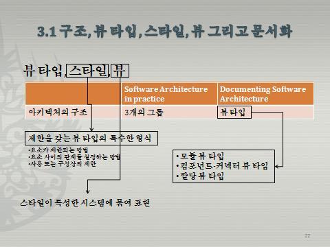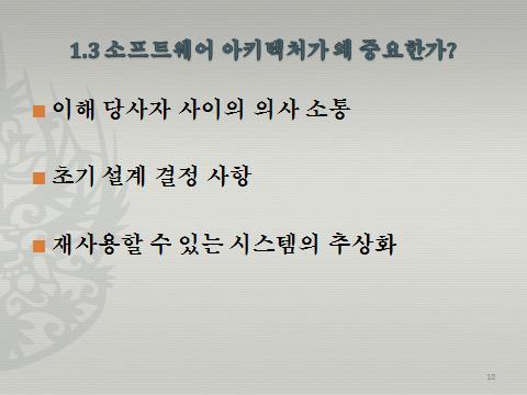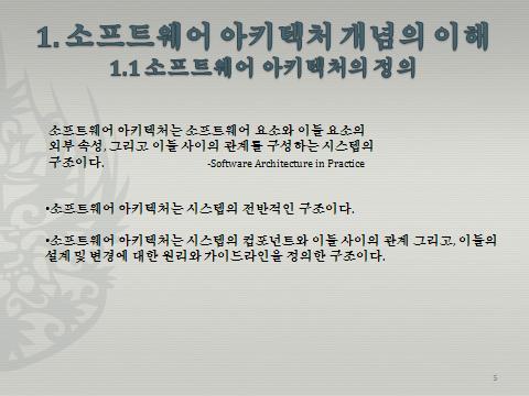 소프트웨어 시스템의 구조는 컴포넌트들과 컴포넌트 사이의 인터페이스 관계를 보여주며 결국 이것을 소프트웨어 아키텍처라 부른다..