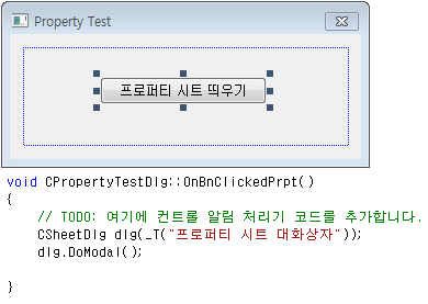 6. 메인 Dialog에 버튼을 추가후 버튼클릭시 프로퍼티 시트가 출력되도록 코딩한다.