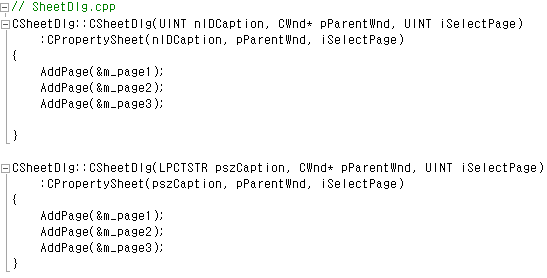 프로퍼티 시트 클래스의 CPP파일에서 생성자 함수안에 AddPage(&선언한 페이지 변수)함수를 호출해준다.