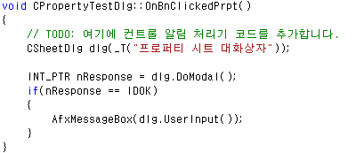 8. 프로퍼티시트의 확인버튼을 눌렀을 때 입력결과를 메시지 박스로 띄워주도록 코드를 조금 수정해준다.
