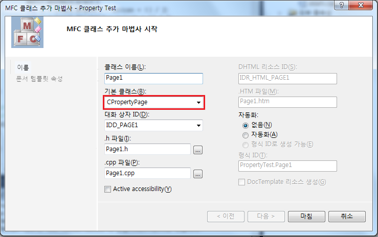 해당 프로젝트에 CPropertyPage를 기본클래스로 하는 MFC클래스를 만들어 준다. (작성자는 CPage1, CPage2, CPage3라는 이름으로 만듦)