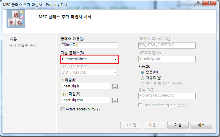 해당 프로젝트에 CPropertySheet를 기본클래스로 하는 MFC클래스를 만들어 준다. (작성자는 CSheetDlg라는 이름으로 만듦)