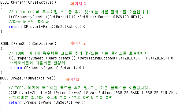 각 페이지클래스에서 페이지가 바뀌어 새로운 페이지가 프로퍼 시트에 출력될 때 마다 호출되는 OnSetActive함수를 그림과 같이 재정의 해준다.