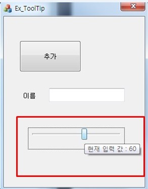 void CEx_ToolTipDlg::OnNeedText(NMHDR *pnmh, LRESULT *pResult) { TOOLTIPTEXT *pttt = (TOOLTIPTEXT *)pnmh; If(pttt->hdr.idForm == (UINT)m_slide.GetSafeHwnd()) { int pos = m_slide.GetPos(); wsprintf(pttt->szText, TEXT(“현재 입력 값 : %d”), pos); } } |