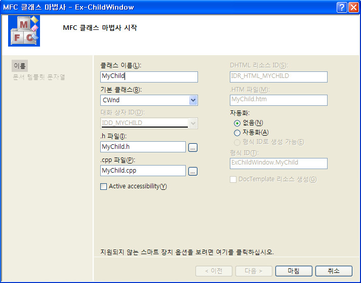 2. CWnd클래스에서 파생된 대화상자의 자식윈도우로 생성하고 싶은 일반윈도우 클래스를 생성합니다.