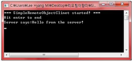 namespace SimpleRemeteObjectClient { class SimpleObjClient { static void Main(string[] args) { Console.WriteLine("*** SimpleRemoteObjectClinet started! ***"); Console.WriteLine("Hit enter to end"); //새로운 HttpChannel을 생성한다. HttpChannel c = new HttpChannel(); ChannelServices.RegisterChannel(c); //원격 WKO 형식에 대한 프록시를 가져온다. object remoteObj = Activator.GetObject(typeof(SimpleRemotingAsm.RemoteMessageObject), "http://localhost:32469/RemoteMsgObj.soap"); //원격 객체를 사용한다. RemoteMessageObject simple = (RemoteMessageObject)remoteObj; simple.DisplayMessage("Hello from the client!"); Console.WriteLine("Server says:{0}", simple.ReturnMessage()); Console.ReadLine();