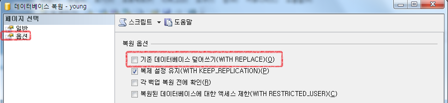기존 데이터베이스를 덮어쓰기를 체크한다. 이 작업을 하지 않으면 로그백업을 하지 않았기 때문에 에러 메세지 출력된다.