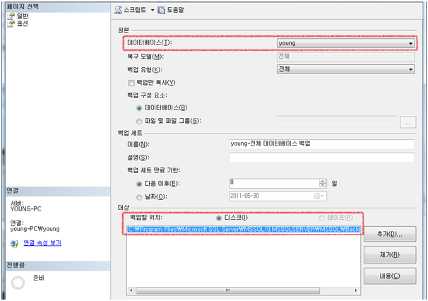 백업할 DB선택 후 백업파일이 저장 될 위치를 지정한다.