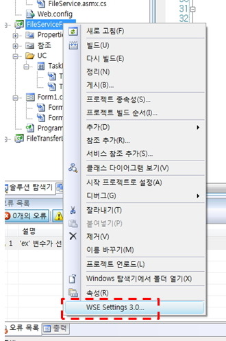 위의 점선 부분처럼 추가해준다. 비주얼스튜디오에서 오른쪽 마우스 버튼을 누르면 WSE3.0 setting이 생긴 것을 볼 수 있다.