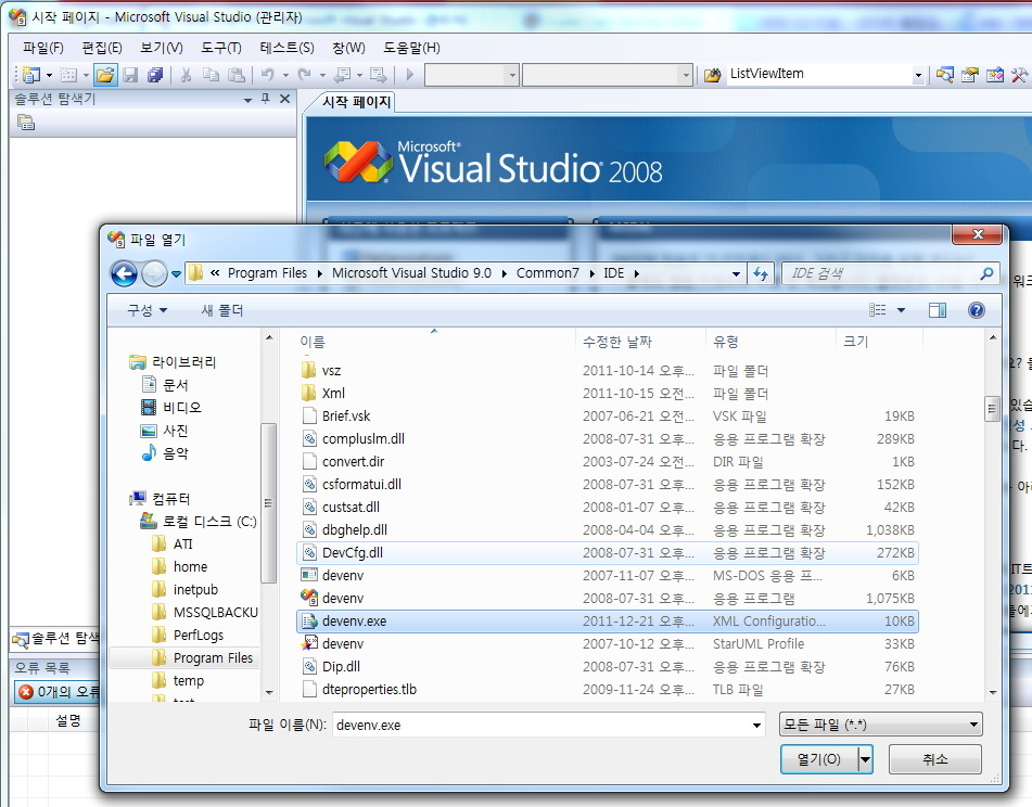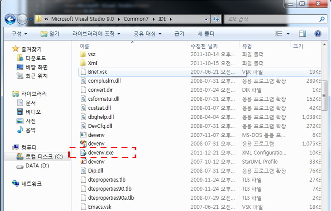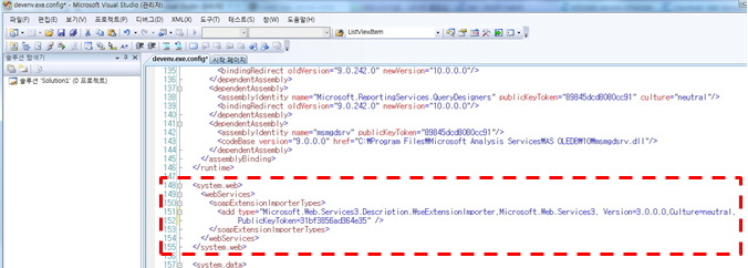 점선 안의 내용처럼 해준다.(있다면 그냥 둠) devenv.exe을 비주얼스튜디오를 통해 열어준다.