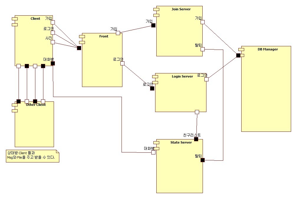 Component Diagram 프로젝트 명 : 비트 톡 (1조) 작성일 : 2012-01-17 작업 명 : 아키텍쳐 개발 도구 : StarUML 조장 : 박종기 조원 : 박기현 백 용 시종진 Component 다이어그램 일련 번호 채널명 채널소유자 채널사용자 설명 1 Reg Client Front USER의 회원 가입 요청 2 Log Client Front USER의 로그인 요청 3 FChat Front Client 로그인 된 회원들 목록 전송 4 Pic Client Front USER의 사진 등록 요청 5 Msg 수신 Client 송신 Client 다른 Client에게 숏 메시지 전송 6 File 수신 Client 송신 Client 다른 Client에게 파일 전송 7 FReg Front Join Server 서버에게 회원 가입 요청 8 FPic Front Join Server 서버에게 사진 저장 요청 9 FLog Front Login Server 서버에게 로그인 요청 10 SChat State Server Front Login된 회원 목록 Front로 전송 11 JReg Join Server DB Manager 가입 정보 DB 매니저에게 전송 14 JPic Join Server DB Manager 사진 정보를 DB매니저에게 전송 15 LLog Login Server DB Manager 로그인 정보를 DB 매니저에게 전송 16 DChat DB Manage State Server 로그인 중인 회원들을 서버에 전송