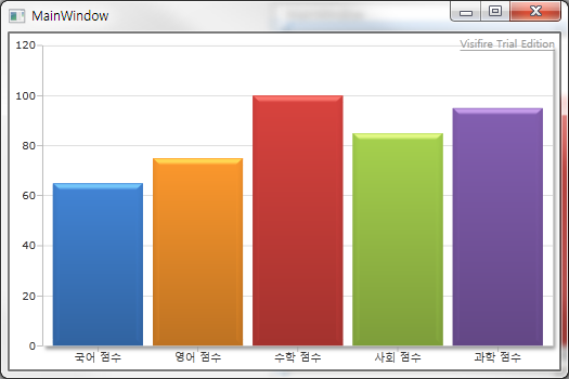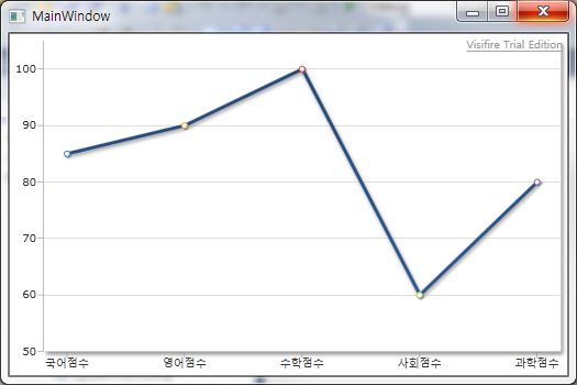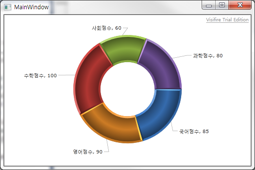 <visifire:Chart.Series> <visifire:DataSeries RenderAs="Doughnut"> <visifire:DataSeries.DataPoints> <visifire:DataPoint AxisXLabel="국어 점수" YValue="85"></visifire:DataPoint> <visifire:DataPoint AxisXLabel="영어 점수" YValue="90"></visifire:DataPoint> <visifire:DataPoint AxisXLabel="수학 점수" YValue="100"></visifire:DataPoint> <visifire:DataPoint AxisXLabel="사회 점수" YValue="60"></visifire:DataPoint> <visifire:DataPoint AxisXLabel="과학 점수" YValue="80"></visifire:DataPoint> </visifire:DataSeries.DataPoints> </visifire:DataSeries> </visifire:Chart.Series> </visifire:Chart> </Grid>