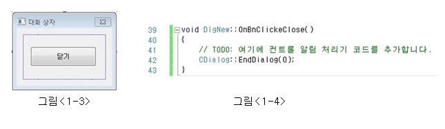 3. 새로운 다이얼로그에도 닫기 버튼을 추가하고 닫기 버튼 이벤트에 닫기 버튼을 눌렀을 시 모달 형식으로 만들어진 창이 종료되도록 EndDialog() 함수를 호출한다.