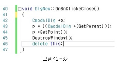 3. 그림<2-3>은 새로운 창이 만들어 지고 그 창의 닫기 버튼을 눌렀을 때 발생하는 이벤트 이다. 모달리스는 DoModal 함수로 생성된 것이 아니기 때문에 EndDialog를 사용할 수 없다. 그래서 그림<2-3>과 같이 DestroyWindow();를 사용해준다.