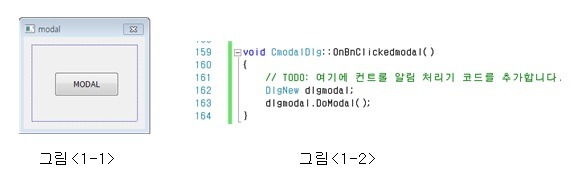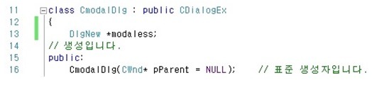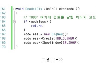 그림 <2-1>에서는 모달리스창를 만들기 위해 모달 예제에서 만든 다이얼로그클래스 형의 포인터를 선언을 했다.