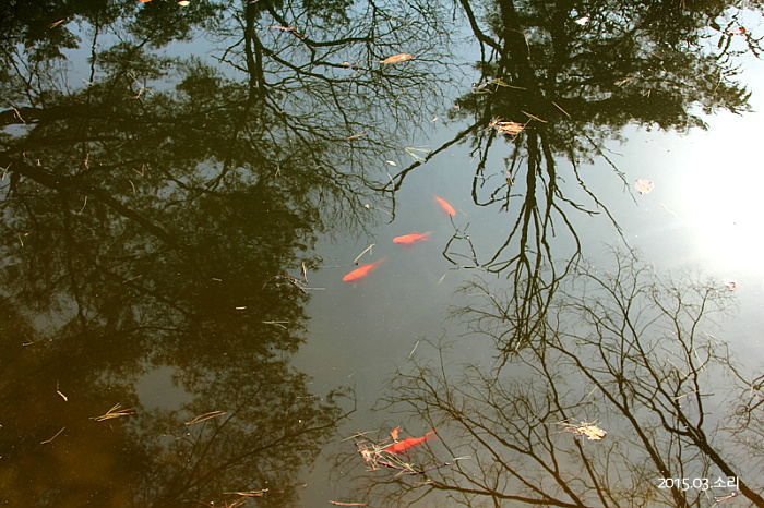 절 마당에 있던 작은 연못, 연못에 하늘이 둥둥...