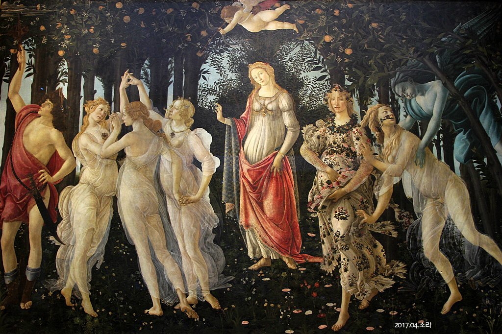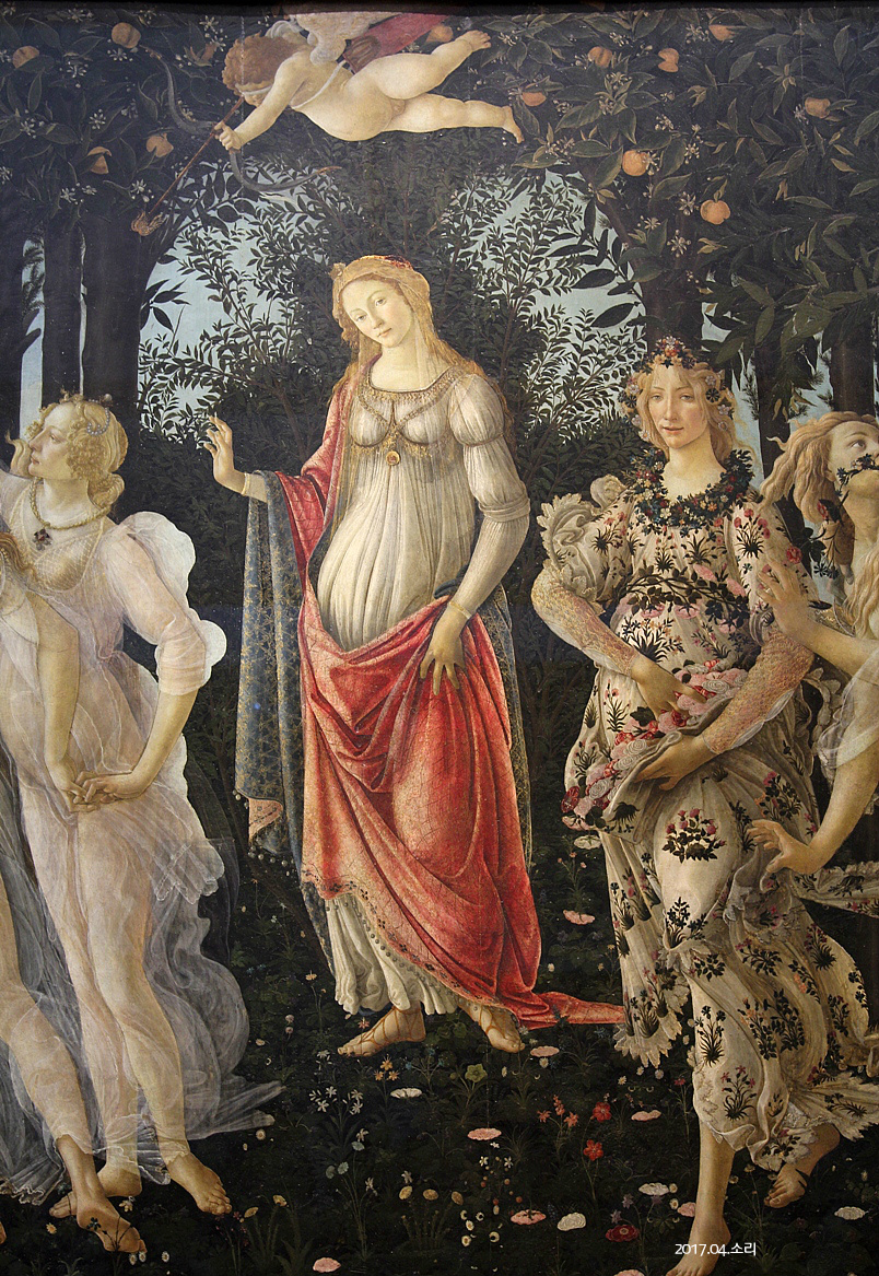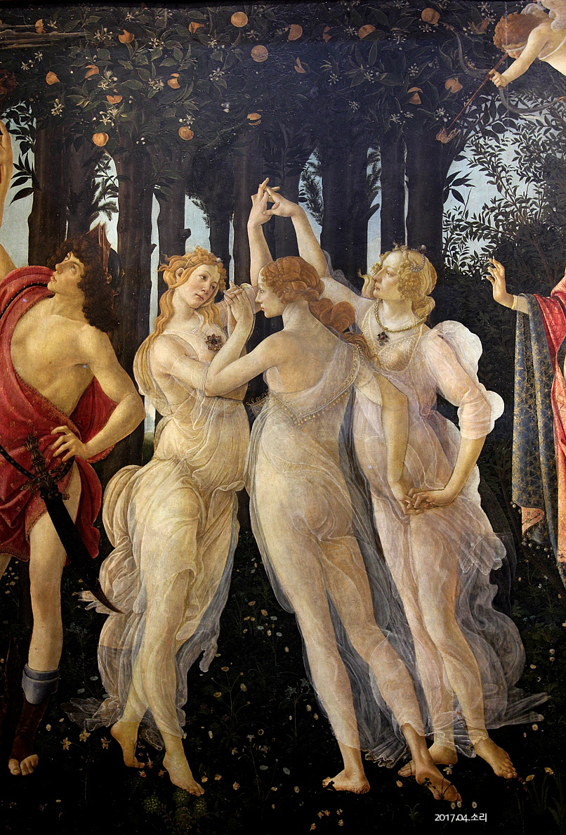 중앙의 세명의 여신은 '삼미신' 이다 비너스를 수행하는'세명의 여신으로