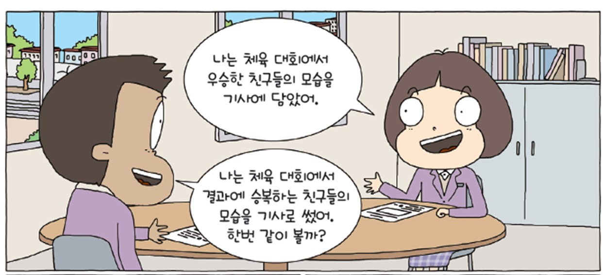 학교 신문부 부원인 바다와 하늘이는 얼마 전에 있었던 학교 체육 대회를 취재했다. 그리고 각자 체육 대회를 다룬 기사를 함께 살펴보는데…….