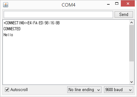 - 연결하고 나면 왼쪽 그림의 시리얼모니터에서처럼 Connected 메세지가 뜨면서 오른쪽 그림에서 Hello를 쳐서 전송하면 글자가 전송되어 보인다.