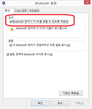 PC의 블루투스 동글을 인식하기 위해서는 다음과 같으 이름 검색을 허용해야 한다.
