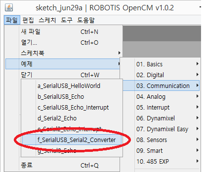 예제-> 03.Communication -> f_SerialUSB_Serial2_Converter 을 클릭한다.