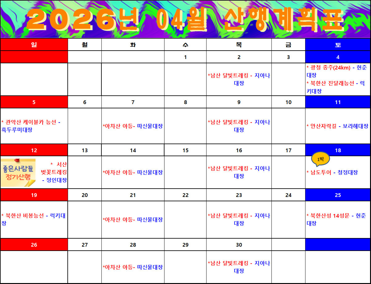 4월 산행계획표 작성자여명|작성시간26.04.01|조회수99 목록 댓글 1 글자크기 작게가 글자크기 크게가 다음검색 현재 게시글 추가 기능 열기 북마크 공유하기 신고 센터로 신고 댓글 댓글 1 댓글쓰기 답글쓰기 댓글 리스트 작성자호야 | 작성시간 26.04.01 new 4월에도 풍성합니다.^^등산하기 좋은계절에 즐거운 산행하세요.모두모두 감사합니다.^^ 댓글 전체보기