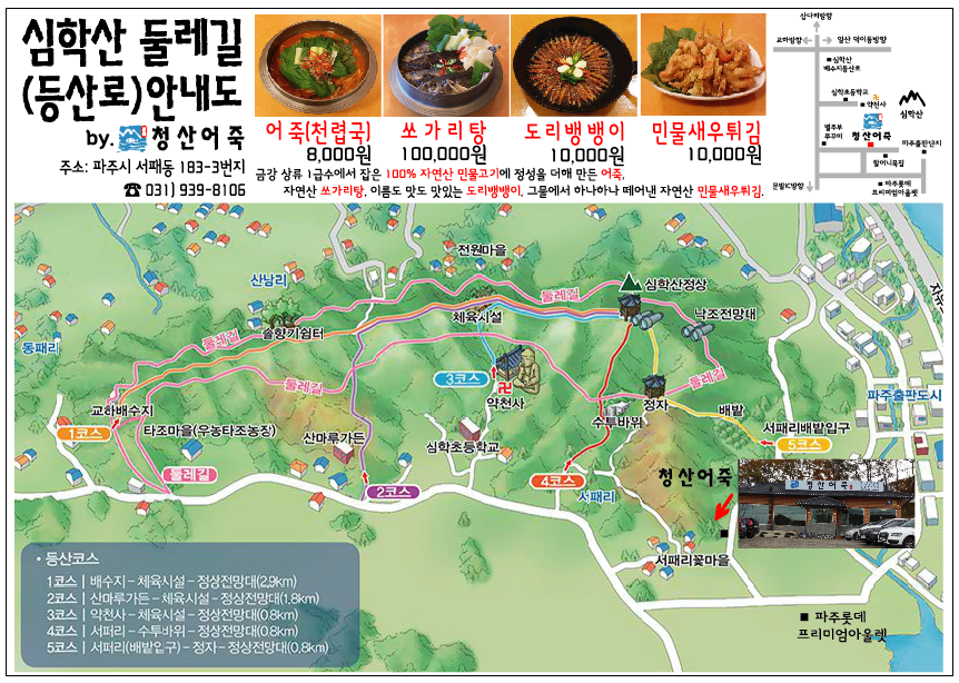 [ 파주 심학산 맛집 "청산어죽" ] 심학산 둘레길 등산로 코스 안내지도 작성자라나|작성시간14.12.19|조회수2,261 목록 댓글 0 글자크기 작게가 글자크기 크게가 [ 파주 심학산 맛집 "청산어죽" ] 심학산 둘레길 등산로 코스 안내지도 사진을 클릭하시면 선명한 이미지가 나타납니다~! 심학산 둘레길 다녀오시고 건강한 맛집 "청산어죽" 꼭 들려주세요~!! 다음검색 현재 게시글 추가 기능 열기 북마크 신고 센터로 신고 댓글 댓글 0 댓글쓰기 답글쓰기 댓글 리스트