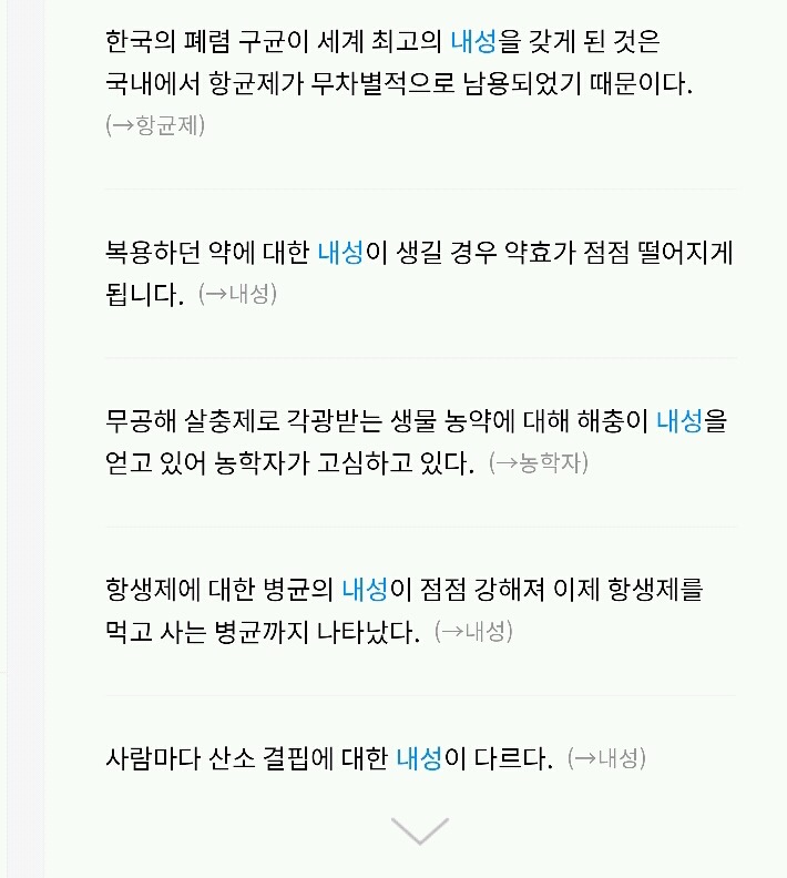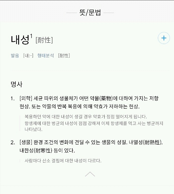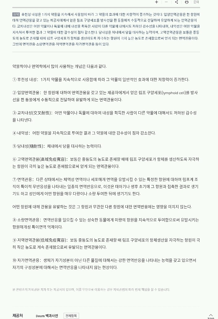 작성자그린이 작성시간 16.06.24 이해를 돕기 위해 첨언하면 내성은 좋은 의미로도 나쁜 의미로도 쓰일 수 있습니다. 예를 들면 위에 있는 내약성은 좋은 거죠. 그래서 약에 대해서는 내약성이 우수하다는 표현을 써요. 인체가 그 약에 대해 빨리 적응하여 부작용을 나타내지 않는다는 뜻이죠.