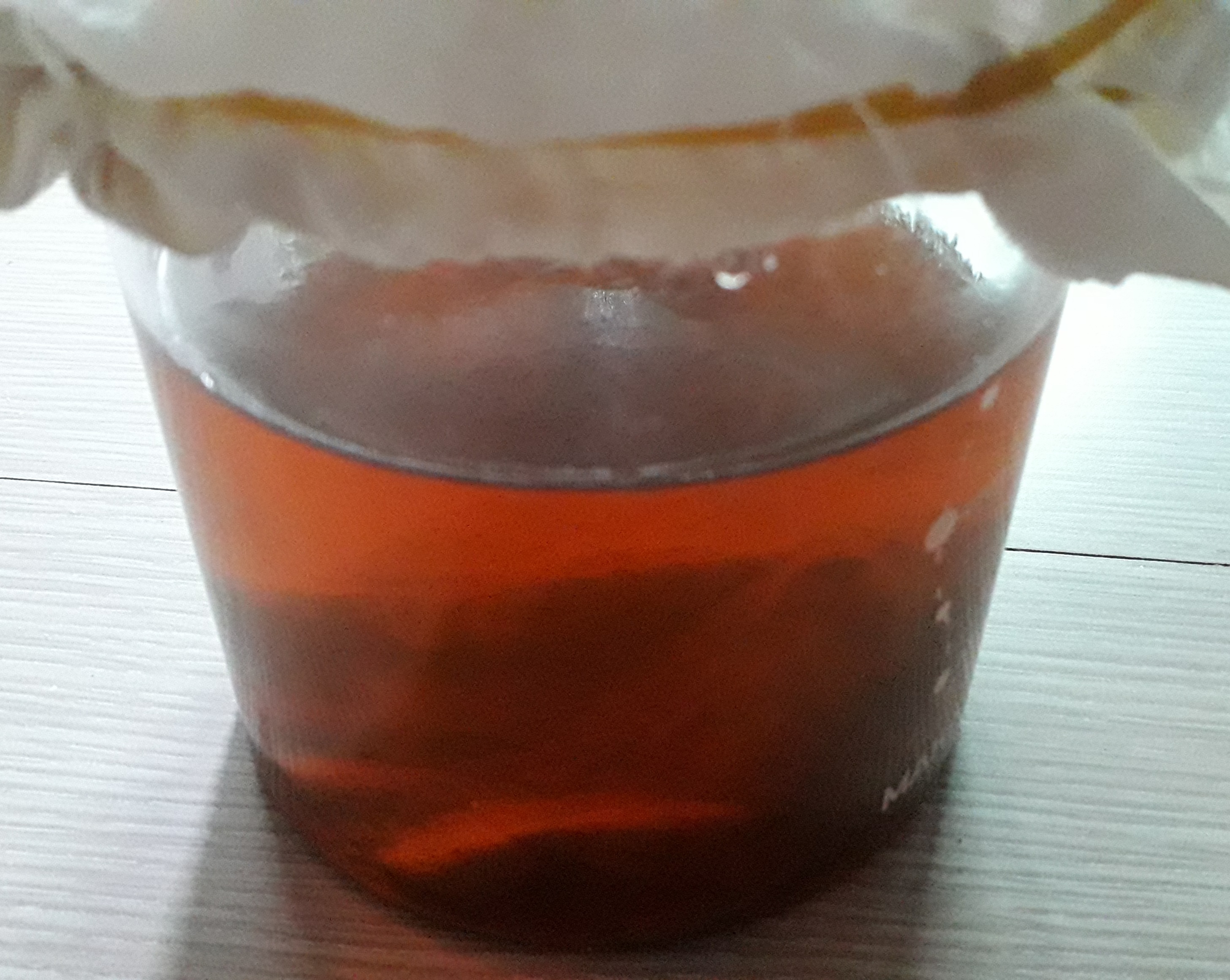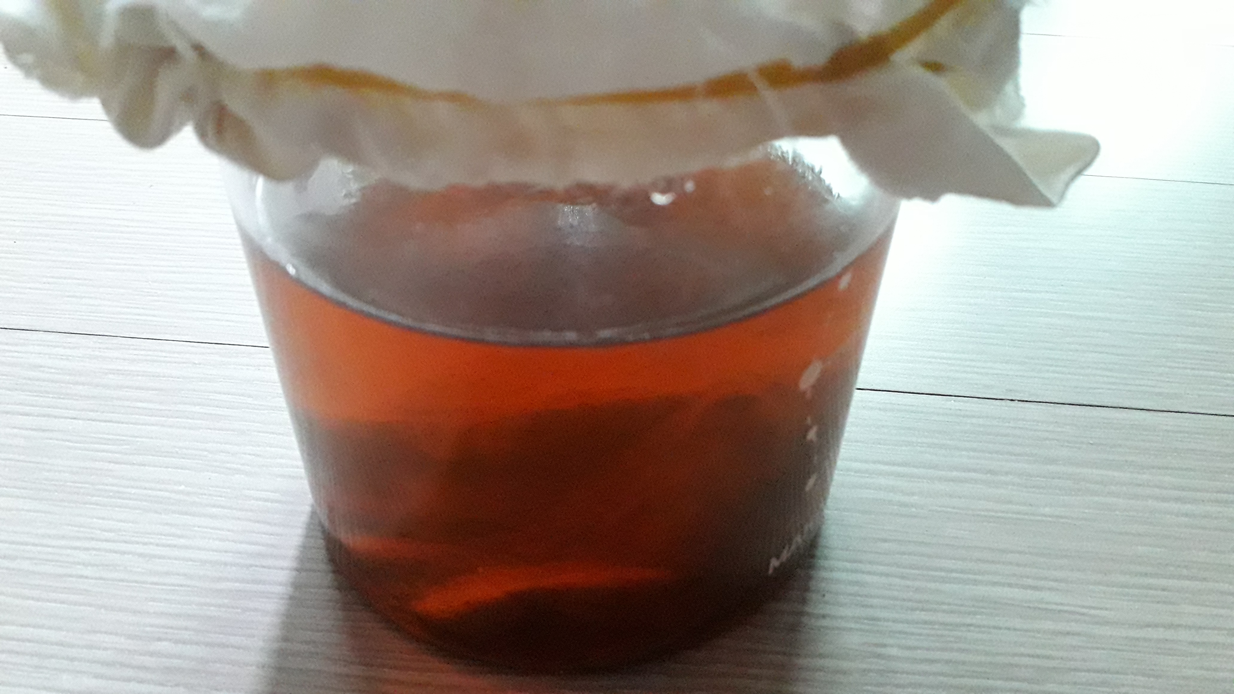 작은 병으로 옮기고 주방 선반으로 옮겨 다시 발효를 시도했지만, 이미 생겼던 스코비는 바닥으로 가라앉아 버렸고 새로운 스코비가 생성되기를 기다렸지만
