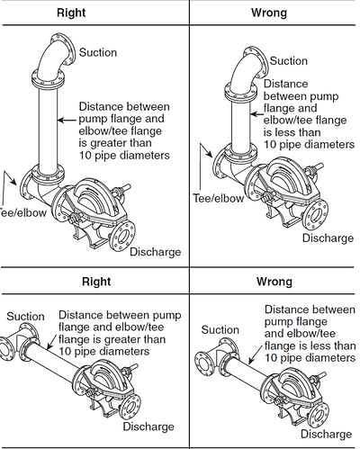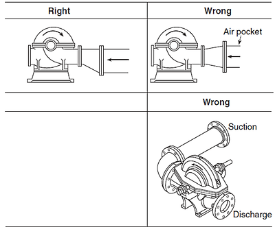 흡입측 배관의 저항이 클 경우에는 케비테이션의 발생으로 운전시 진동이 커져 펌프의 성능에 나쁜 영향을 주게 됩니다.따라서 펌프 흡입측에 연결되는 관부속간의 거리는, 관경의 최소 10배 이상은 이격되어야 하며, 와류와 공동현상으로 인한 펌프 흡입성능 저하를 막기위해 편심레듀셔를 설치하여야 한다.