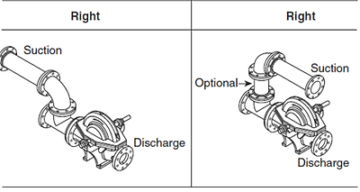 펌프의 흡입측 배관은 유체흐름에 영향을 주지 않도록 흡입측 배관 구경의 10배 이상의 직관을 확보하고 편심레듀셔를 사용하여야 합니다.
