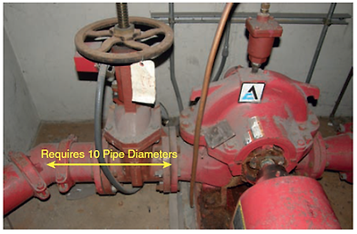 사진은 펌프흡입측 배관길이가 구경의 10배 기준에 미치지 못한 사례입니다.
