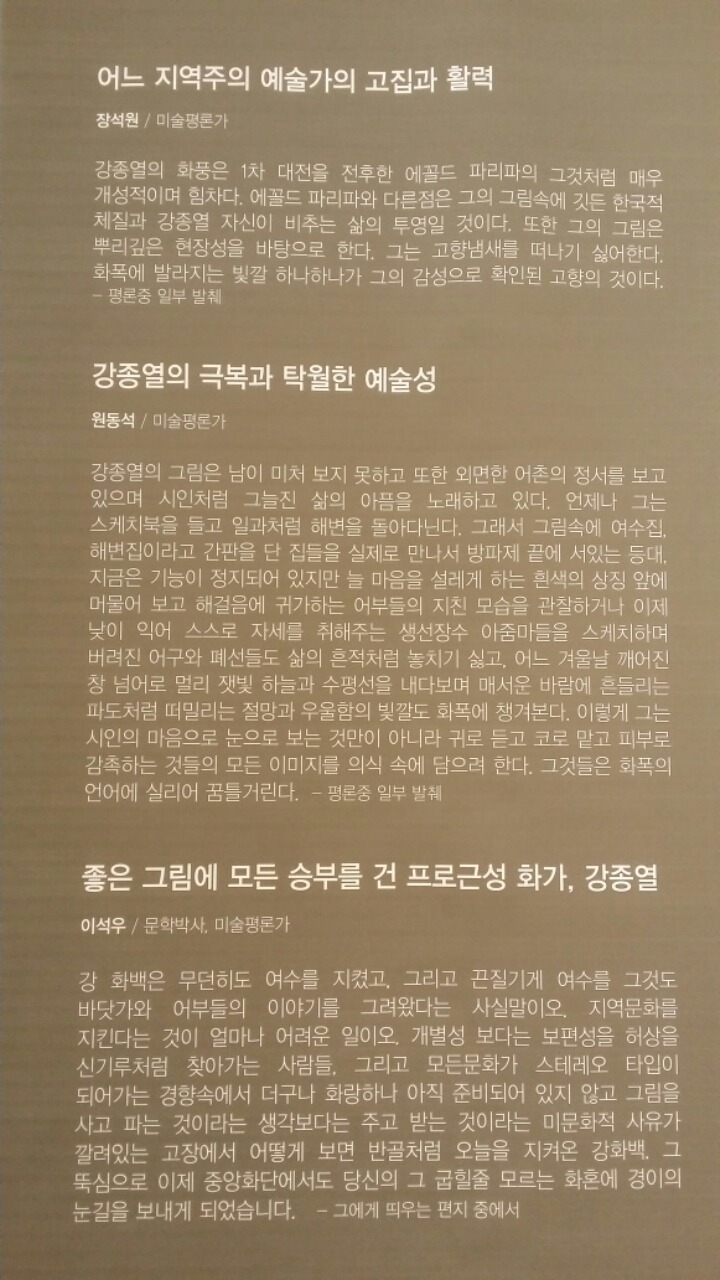 강종래(강종열화백의 형) 작가의 소개로 알게된 강화백은 개인적으로는 손상기화백 이후 나에게 강한 임팩으로 다가온 우리고장 작가 중에 한 분이시며, 실현 가능할지 모르겠지만 언젠가 꼭 한점 소장하고 싶다는 욕구를 불러일으키게 하는 작가이다.