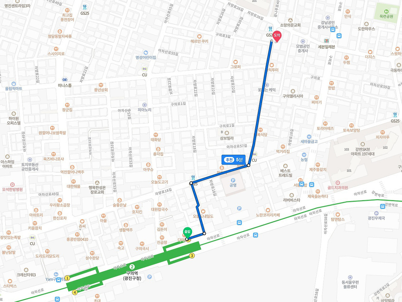 작성자ccambo6968c 작성시간 25.06.28 구의역 2번 출구로 나오셔서 바로 보이는 골목안으로 들어오셔서 gs 에서 cu 쪽으로 꺾어져서 들어오셔서 오른쪽 그믐달 주차장 안쪽으로 아차산로 57길 38 안으로 들어오세요