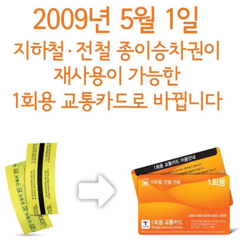 ▷ 5월 1일부터 1회용 교통카드가 도입되며 이용자의 혼란방지를 위해 당분간 종이승차권도 병행이용하실 수 있습니다.