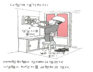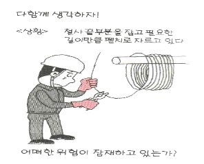 가. 다치고 나서 아무리 괴로워해도 소용이 없다. 작업을 하기 전에 잠시 그 작업에 대한 위험을 생각하여 구체적으로 대처하고, 또 동료와 의논한다면 대부분의 재해를 방지할 수 있다.