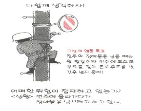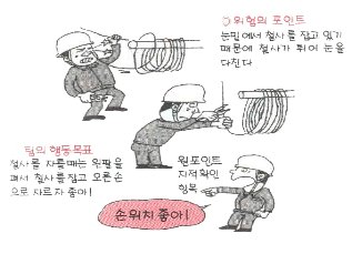 나. 누구라도 다치고 싶어서 다치는 것은 아니다. 어떻게 하면 좋은가. 작업을 시작하기 전에 이 작업에 어떠한 위험이 잠재하고 있는가를 한 사람 한 사람이 생각한다. 가능하면 작업하는 사람들이 함께 위험에 대하여 어떻게 하면 좋은가를 본심으로 신속하게 의논하여 그 대책을 실천한다. 나아가서 작업의 요소요소에서 마음을 쏟아서 날카롭게 지적확인을 하여 안전 즉, 위험의 포인트를 확인한다. 이것이 안전선취의 위험예지활동이다.