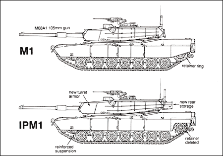 [M1 전차는 개발완료하여 배치되는 때부터 꾸준하게 개량이 가해졌는데 이는 초기 MBT-70 의 비용증대에 대해 반대하는 의회의 의심을 피해보려는 의도였다]